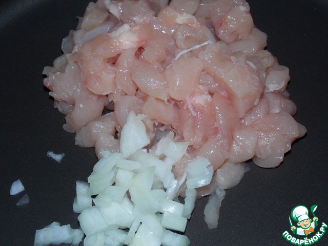 Лук и филе порезать кубиком, обжарить на растительном масле до готовности.