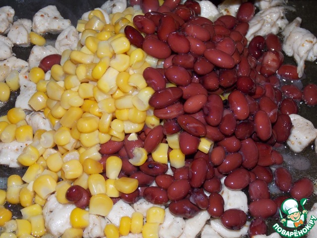 Добавить фасоль и кукурузу без жидкости. Посолить и поперчить по вкусу. Перемешать.