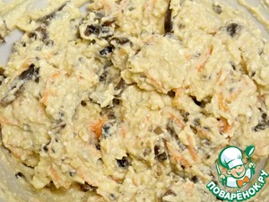 Смешать творог, оставшийся соевый соус "Kikkoman", грибы, майонез, морковь, тертый чеснок.