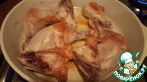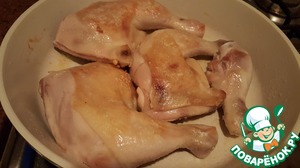 Разогреть на сковороде пол ложки топлёного масла и выложить окорочка кожей вниз.