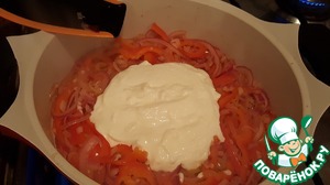 Добавить к овощам сметану, перемешать, довести до кипения сметаны, накрыть крышкой и тушить на слабом огне пару минут.