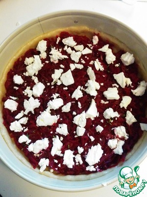 Тесто распределяем в форме (диаметр 24 см). Сверху выкладываем свеклу, кусочки феты и заливаем яично-сметанной заливкой.