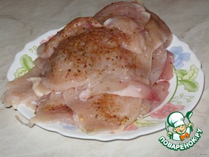 Вот и в этом случае, берем филе разрезаем на порции вдоль, немного отбиваем, посыпаем приправой и солью(немного, стараюсь соль употреблять по-минимуму).