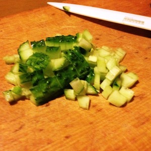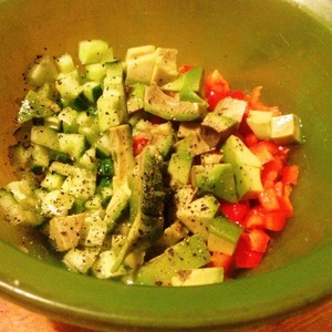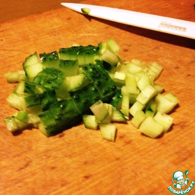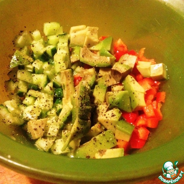 Авокадо очистить от кожицы, удалить косточку, нарезать кубиками.