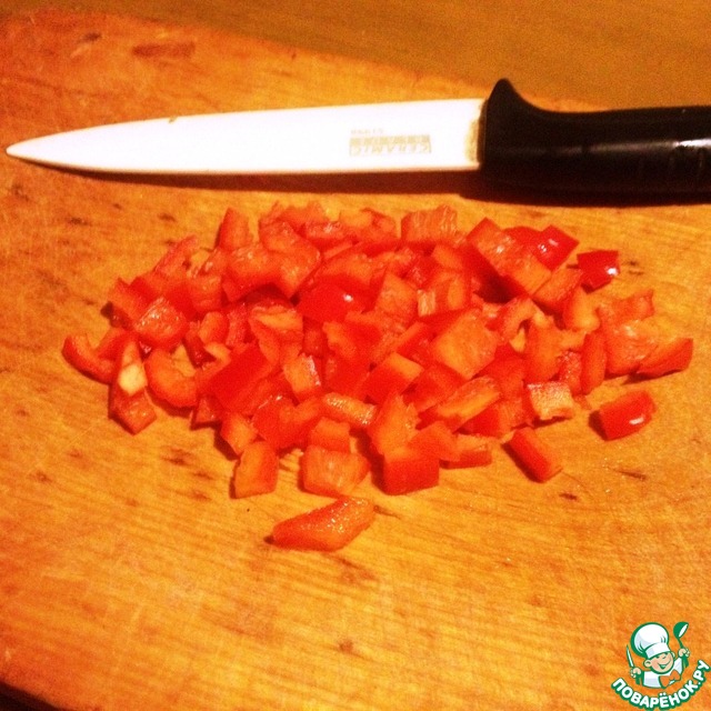 Болгарский перец (у меня сорта "Ласточка") вымыть, обсушить, удалить сердцевину и нарезать кубиками.