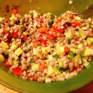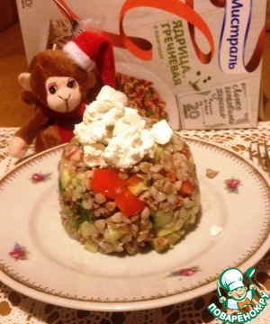 Лёгкий, необременительный для желудка и в то же время полезный салат. Одно из достоинств - почти отсутствие соли (используется только при варке крупы). Я бы отнесла его к "девчачьим" салатам (подруги от него в восторге), но его с удовольствием поглощает на ужин и сын после работы. Так что какой он - вам судить.