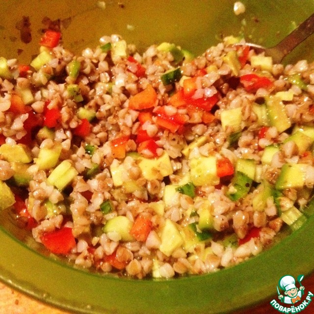 Добавить охлаждённую отварную гречу, полить оливковым маслом и перемешать.