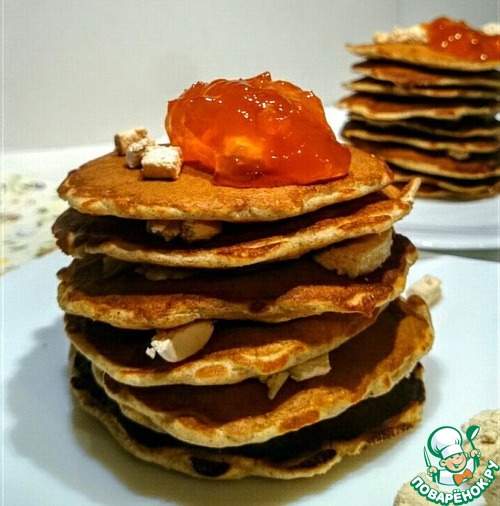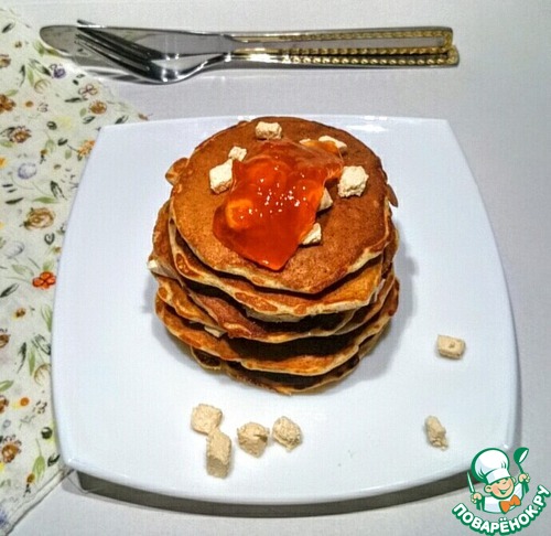 Далее можно выпекать небольшие "блинчики", обжаривая с двух сторон по минуте, выкладывать их на тарелку стопочкой, прокладывая между "блинчиками", например, кусочки зефира. Сверху можно украсить любимым джемом! Наш любимый - абрикосовый!