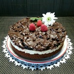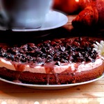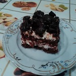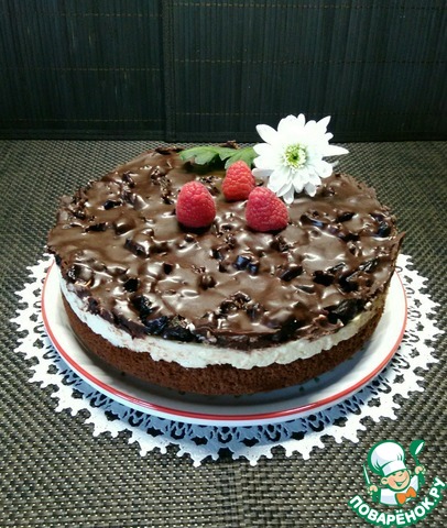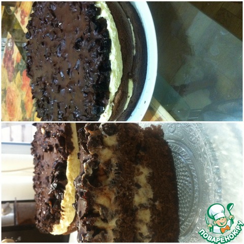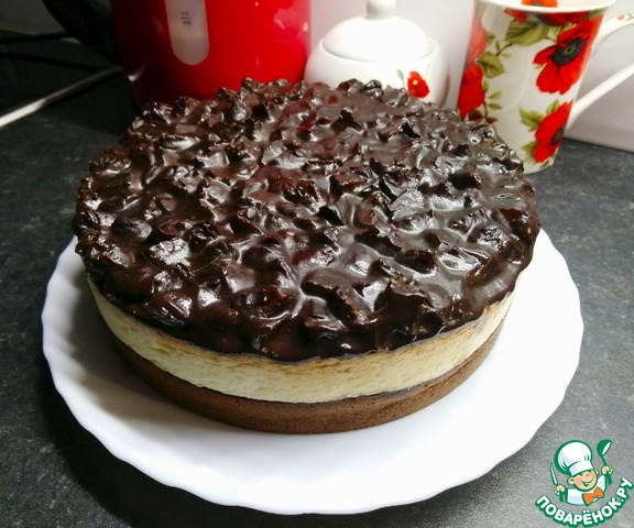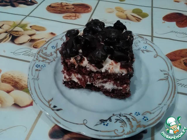 [+4]Мой вариант с отступлением от оригинальной рецептуры - шоколадный бисквит приготовлен по другой технологии, в качестве загустителя крема использовала манную крупу, наполнитель для глазури - вишня.