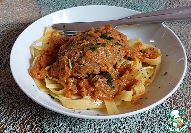 Добавляем томатную пасту и воду. Солим. Все вместе потушить минут 10.