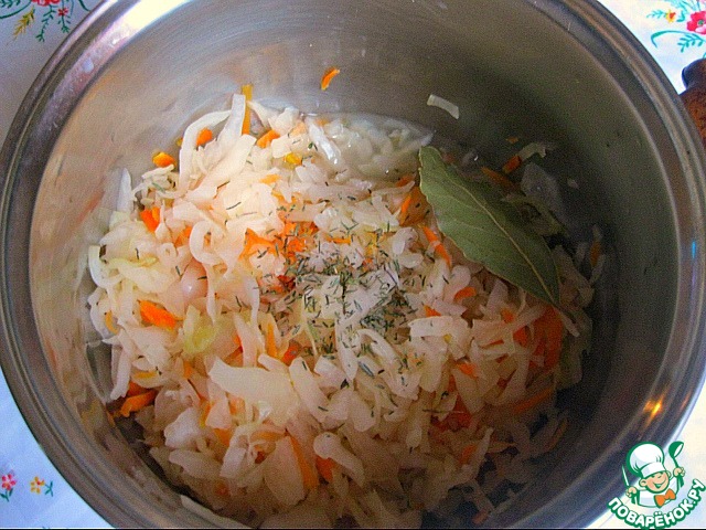 Капусту отжать от лишнего сока, мелко порезать. Положить в небольшую кастрюлю. Залить горячим бульоном, добавить лавровый лист и тимьян. Тушить, под крышкой, на небольшом огне 30 мин. Затем снять крышку, увеличить огонь и дать оставшейся жидкости выпариться. Убрать лавровый лист. -