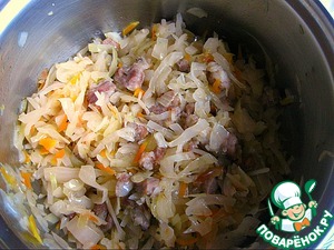 Пока тушится капуста, грудинку и лук нарезать мелким кубиком. Обжарить на сухой сковороде сначала грудинку, затем добавить лук. И продолжать обжаривать до прозрачности лука.