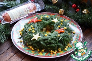 Украшаем салат - рождественский венок - сверху зеленью укропа, кукурузой, из сыра и болгарского перца можно украсить фигурами в виде звезд.