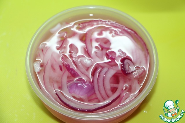 Синий лук порезать полукольцами и замариновать на 30 минут в холодной кипяченой воде с добавлением уксуса и сахарного песка.