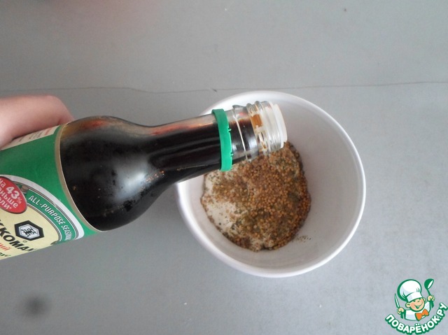 • Смешиваем семена горчицы, соевый соус, соль, орех мускатный, сметану.