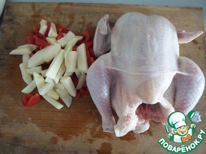 • Картофель и перец режем соломкой, курицу моем, удаляем лишнюю влагу.