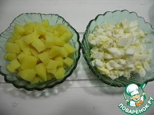 Яйца и картофель отварить. Картофель нарезать небольшими кубиками, яйца нашинковать.