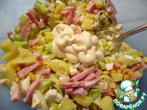 Все ингредиенты смешать, посолить, заправить майонезом.
