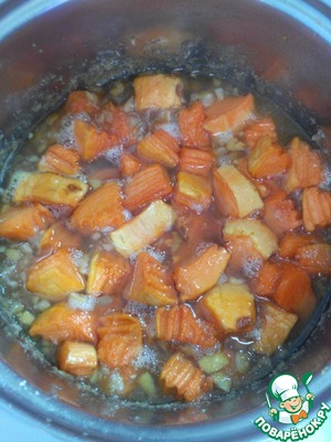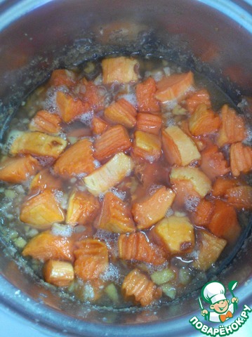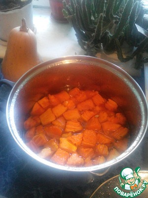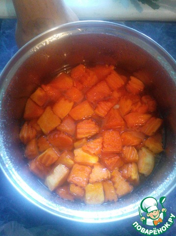 Утром сироп слить, прокипятить, снова залить тыкву и оставить на ночь На следующий день проварить сироп вместе с тыквой 5-10 мин на слабом огне.