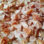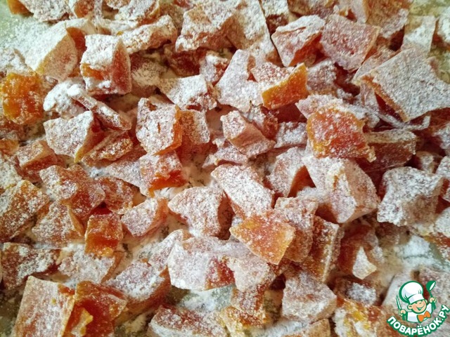 Вынуть будущие цукаты на противень, застеленный бумагой для выпечки или силиконовым ковриком, как у меня. Поставить в духовку, нагретую до температуры 50-60 градусов. Сушить с приоткрытой дверцей 1,5 - 2 часа. Я просто вставляю в приоткрытую дверцу духовки деревянную лопатку. Следить, чтобы цукаты не подгорели. Иначе вместо рахат-лукума получим кусочки горелой карамели.