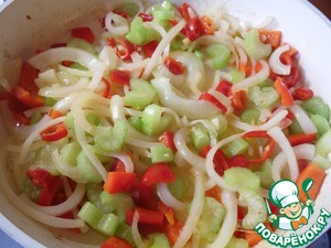 Перец нарезать небольшими кубиками, чили - колечками, сельдерей - небольшими кусочками, лук - полукольцами, чеснок измельчить