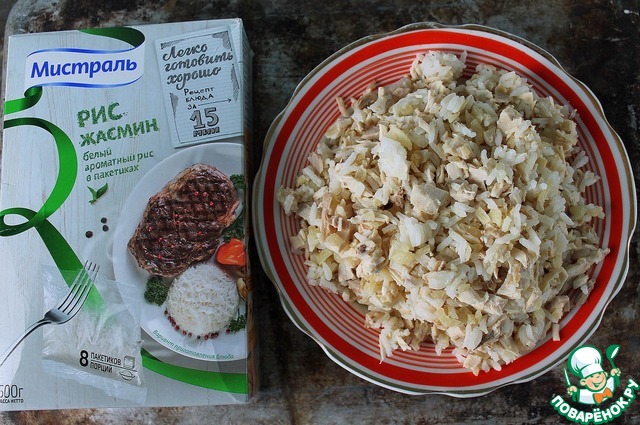 Соединить рис, лук и курицу. Посолить и поперчить.