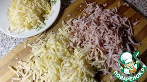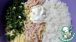 Смешать сыр, ветчину, мелко нарезанную зелень, сметану и толченый чеснок. Добавить горячий рис, он начнет плавить сыр, и начинка не будет рассыпаться.