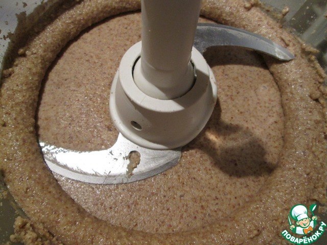 Пересыпьте орехи в чашу блендера и измельчите на высокой скорости. Сначала орехи превратятся в сухую массу. Продолжайте измельчать, периодически выключая блендер, чтобы соскрести миндальную массу со стенок.