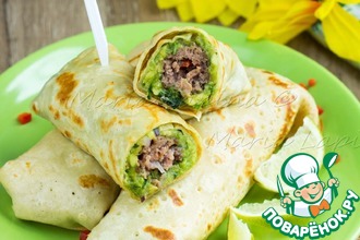 4 Завернуть приготовленную начинку из фарша в блинчики.