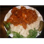 На раскаленной сковороде, с добавлением 2-х ст. ложек масла, обжарить со всех сторон нарезанную тонкими лепестками курицу, влить половину приготовленного соуса, добавить томатную пасту, - перемешать и потушить минуты 2-3, до готовности, подсолить по вкусу.