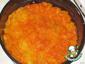Форму выстелить пергаментной бумагой, смазать маслом и на дно выложить курагу,