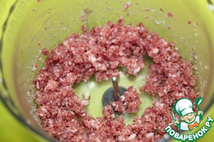 Поместить ломтики колбасы в чашу блендера