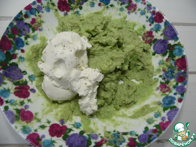 Горошек отварить в кипящей подсоленной воде, остудить. Вместе с авокадо пюрировать блендером. Добавить творожный сыр, все хорошо перемешать.