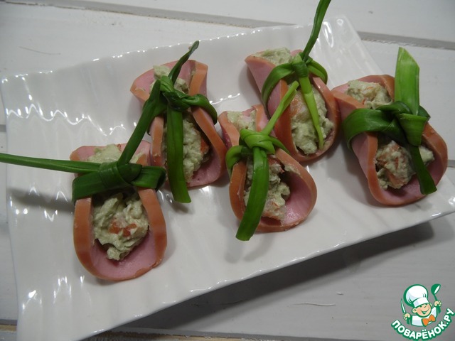 На ломтики колбасы, в центр, столовой ложкой выложить начинку. Края приподнять, зафиксировать зеленым луком.
