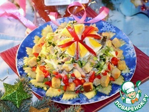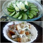 6. Выложить в большую миску приготовленные ингредиенты, добавить половину сухариков, перемешать и заправить соусом.