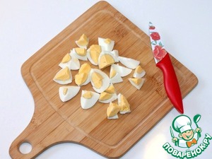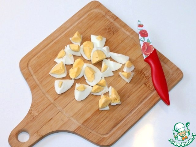 2. Яйца сварить, остудить и нарезать дольками. Немного отложить для украшения салата.