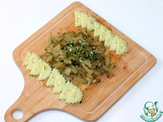 4... огурцы, нарезать брусочками. Свежий огурец красиво порезать и оставить для украшения салата.