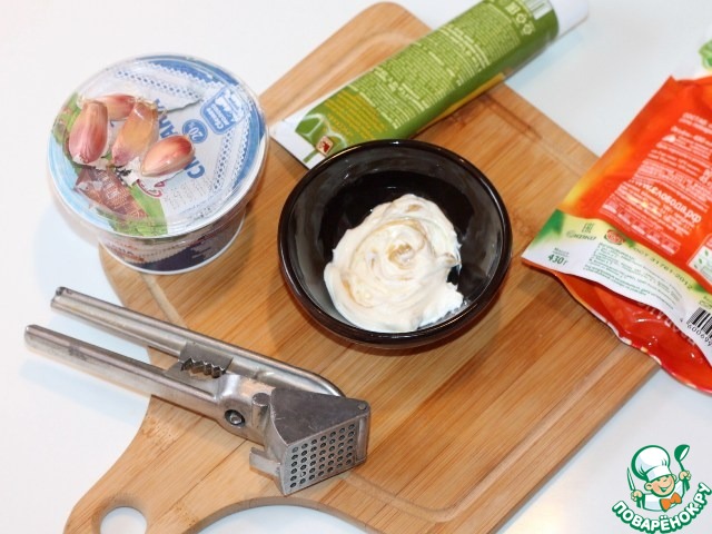 5. Выдавить зубчик чеснока. Смешать все ингредиенты для соуса и взбить.