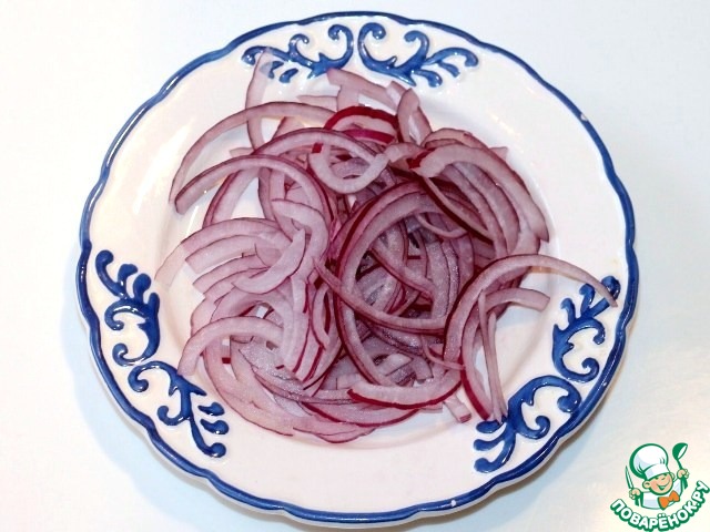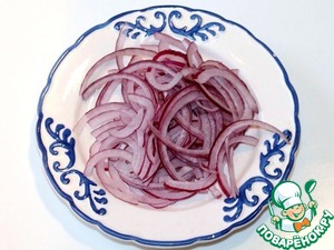 6. Луковицы очистить, разрезать пополам и каждую половинку нашинковать тонкими полукольцами. Репчатый лук залить горячей водой, для того, чтобы ушла горечь.