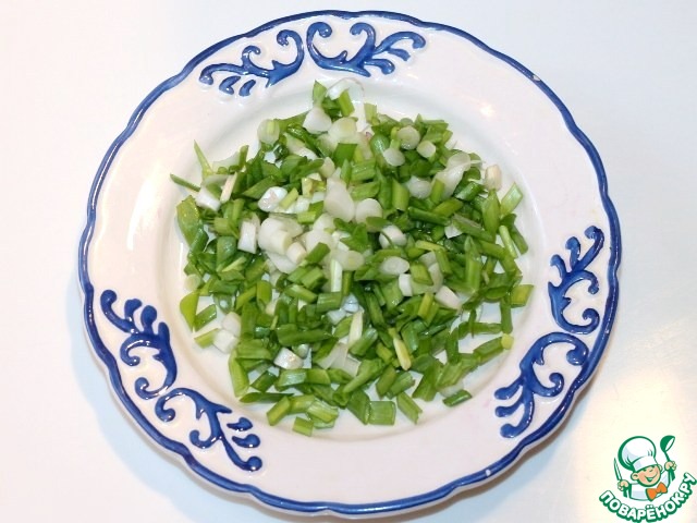 4. Зелёный лук тщательно вымыть, обсушить и нарезать тонкими колечками.