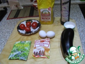 Смешать муку с разрыхлителем. Яйца взбить с орегано. Помидоры разрезать пополам. Смешать с баклажанами.