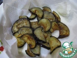 Баклажаны порезать ломтиками толщиной 5 мм., посыпать солью и оставить на 20 мин. чтобы удалить излишнюю влагу и горечь. Затем смыть соль и отжать. Разогреть сковороду и обжарить на половине масла до золотистого цвета с двух сторон по 5 мин. Обсушить.