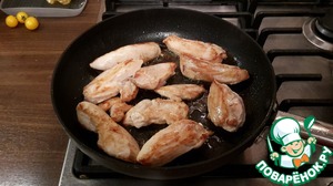 Курицу нарезать на порционные куски (если это грудка), посолить, поперчить по вкусу и быстро обжарить на растопленном масле до образования румяной корочки. При этом курица останется полусырой. На этом этапе главное - образование красивой корочки. Переложить на тарелку.