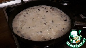 К грибам влить вино, бульон и добавить горчицу. Подождать, пока соус закипит.