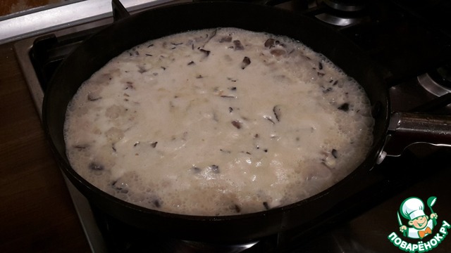 Добавить сливки. Всё перемешать и варить на медленном огне 10-15 минут до того момента, пока соус не загустеет. Посолить и поперчить по вкусу.