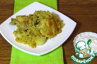 Подать куриные голени с рисом и чечевицей.