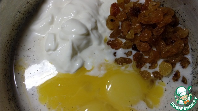 Стручок ванили убрать. Добавить к молоку рис, изюм, сметану и желтки.