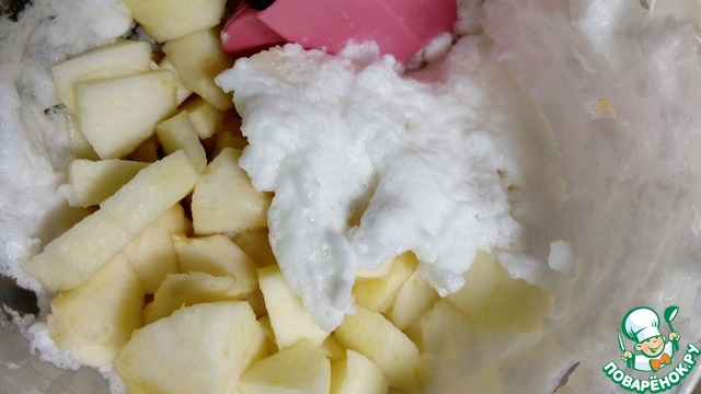 Яблоки очистить от кожуры и сердцевины, половину порезать кубиком и смешать со взбитыми белками. Аккуратно соединить с рисовой массой.