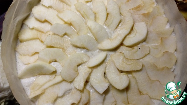 Выложить начинку поверх коржа, отложенные яблоки нарезать дольками и украсить пирог.