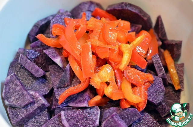 Сладкий перец (можно взять замороженный) разрежьте пополам, удалите семена и перегородки, нарежьте кубиками. Добавьте к картофелю.